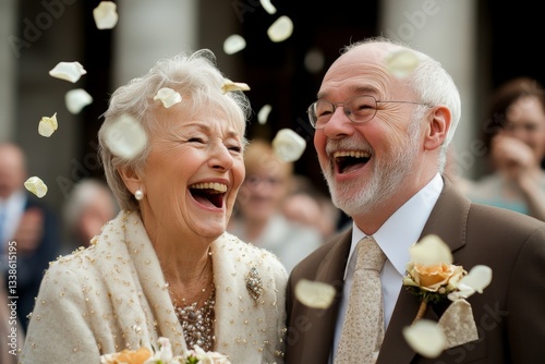 Elderly couple celebrates joyful moment surrounded by flower petals during wedding ceremony in a beautiful outdoor setting