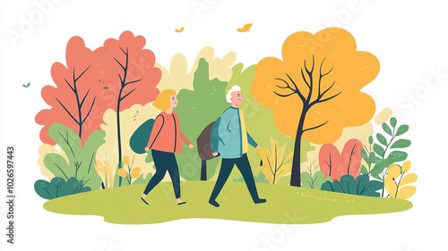 elderly couple enjoying a stroll in the park, vector style that is colorful, simple, and minimalistic, in a cartoon style. Senior couple in good health, retired couple walking, outdoor activity for se