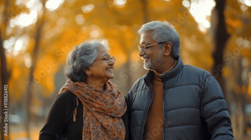 Elderly couple enjoying an autumnal walk in the park, sharing a warm smile and laughter as they embrace each other's company.