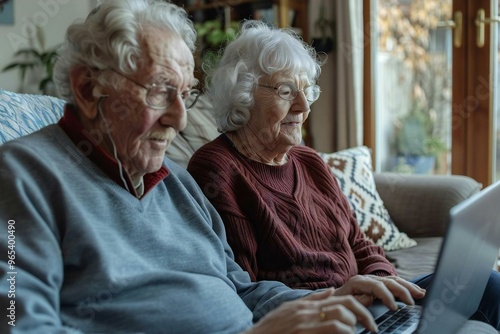 Elderly couple enjoying working together on a laptop while sitting on a cozy couch, surrounded by modern technology.