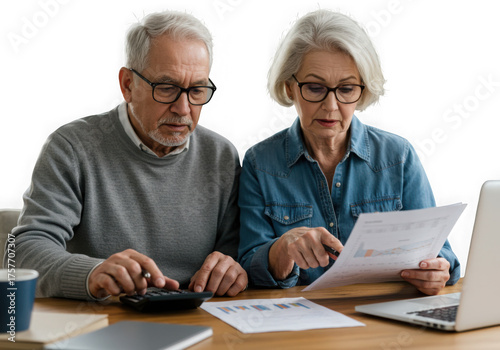Elderly couple reviewing documents and using calculator isolated on transparent background