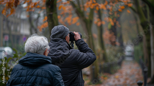 Elderly couple taking a photography walk, capturing nature and street scenes with their cameras.