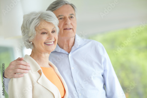 Elderly couple, thinking and hug with smile in home for retirement, support or romantic connection. Happy, senior man and woman with embrace in house for marriage, bonding or love on weekend together