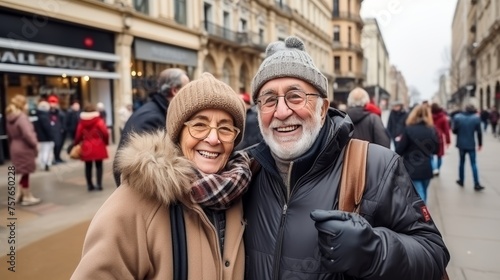 Elderly european couple smiling while taking selfie with urban downtown view in background