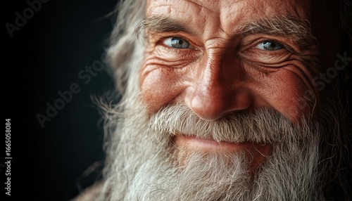 Elderly Gentleman Sporting A Lengthy Beard And Warm Grin Against A Dark Background - A Portrait Of Timelessness And Joy.