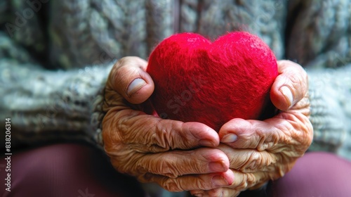 Elderly hands clasping a red heart against a soft background, highlighting the emotional connection and support for caregivers