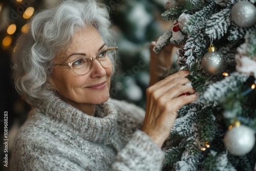 elderly holiday decorating, elderly lady happily decorates christmas tree at home, leaving space for text in the background, embodies holiday joy
