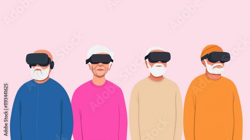 Elderly Individuals of Diverse Backgrounds Wearing Virtual Reality Headsets on Pastel Background Reflecting Technology and Inclusivity