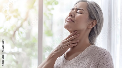 Elderly lady gently holding neck, relaxed with closed eyes, symbolizing comfort or pain relief.