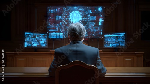 Elderly leader faces complex data displays in a dimly lit room, contemplating strategic decisions.