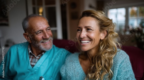 Elderly male nurse and smiling woman enjoying a heartfelt moment indoors