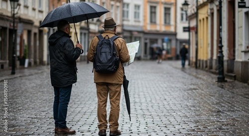 Elderly male traveler with backpack asking directions on cobbled street in light drizzle