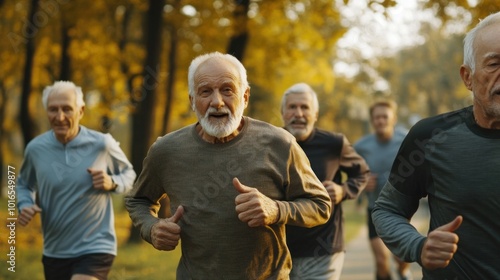 Elderly man and friend running together in the park Their faces glowed with energy and good health.