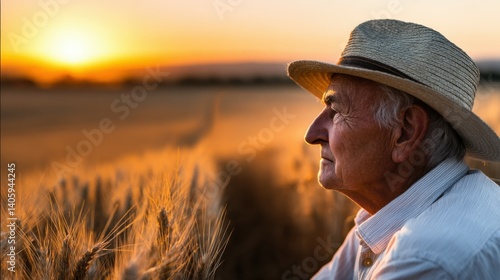 Elderly man enjoys sunset over wheat field