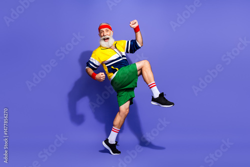 Elderly man enthusiastically performing a vintage style fitness routine in retro clothing with vibrant colors against a solid background