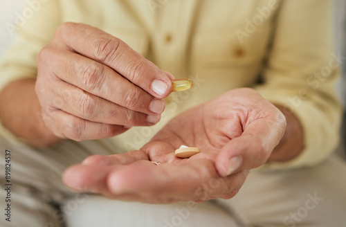 Elderly man, hands and pills or treatment in house, illness management and prescription drugs or hypertension. Capsule, antibiotic and pharmaceutical product in retirement, patient and health routine