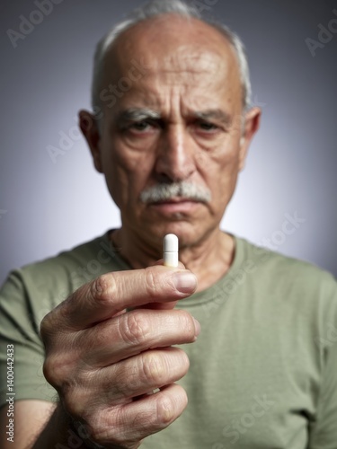 Elderly man holding a pill with a serious expression in a softly lit setting