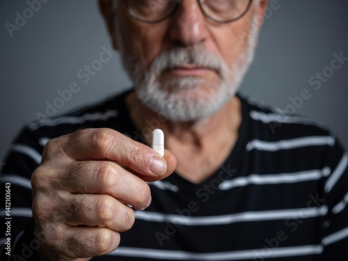Elderly man holding a white pill with a serious expression in a dimly lit room