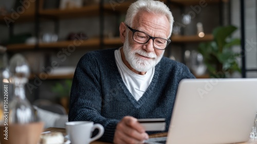 Elderly man online shopping on laptop computer wearing reading glasses in comfortable home office, senior digital commerce and modern convenience concept.