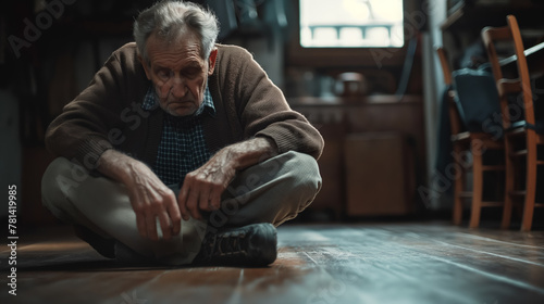 Elderly man sits on the floor, his expression one of sorrow or despair, in a dimly lit room.