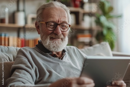 Elderly man smiling while using digital tablet at home - Technology and retirement
