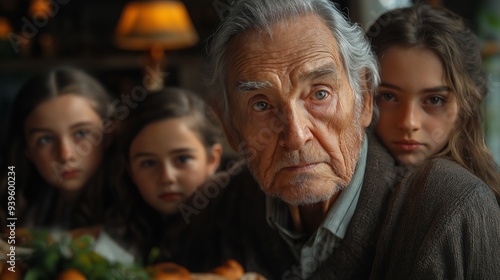 Elderly man surrounded by his attentive grandchildren, sitting together in a warm, cozy living room setting, capturing the essence of family bonding and generations coming together