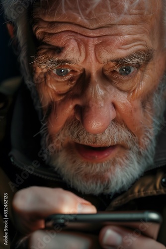 Elderly Man Using Smartphone With Surprised Expression. Generative AI