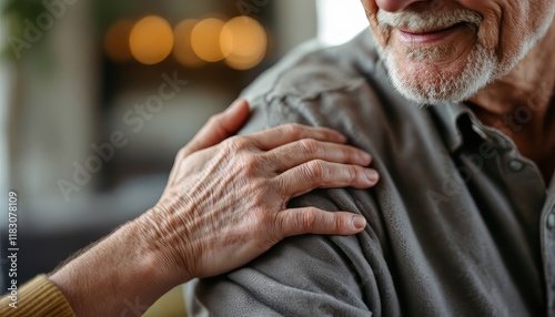 Elderly man with a warm smile receiving comfort from a caregiver.