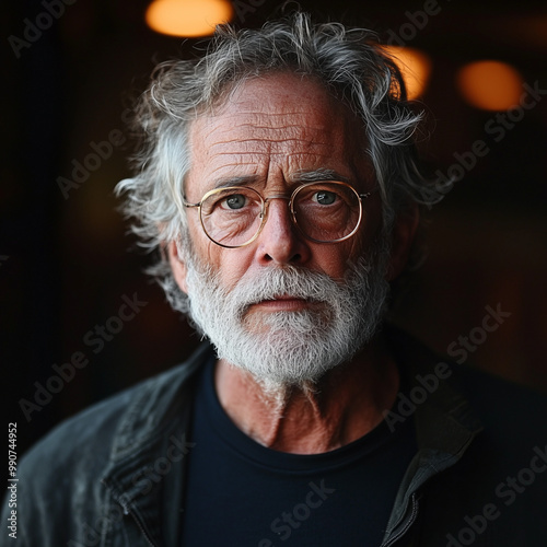 Elderly man with beard and glasses gazing thoughtfully in warm lighting
