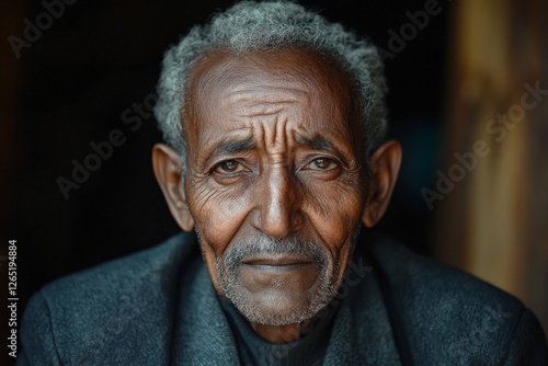 Elderly man with expressive features and deep wrinkles looking thoughtfully in a rustic setting