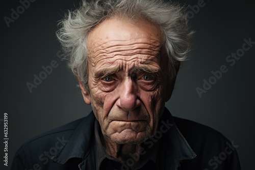 Elderly man with tears in his eyes, set against a muted grey background - Deep sorrow - AI Generated