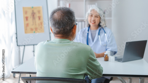 Elderly medical asian people with patient, Physical check-ups and encouragement for treatment of rheumatism and cancer The concept of health insurance for the elderly and health care