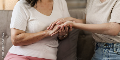 Elderly mother and grown daughter holding hands sitting on the sofa To show love, encouragement and concern