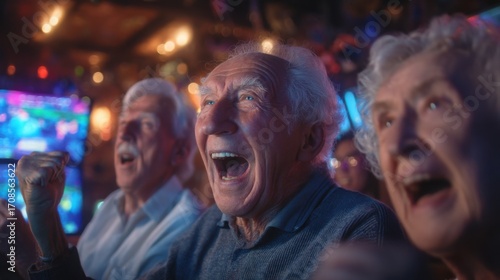 Elderly people cheering and celebrating at a lively casino or entertainment venue with vibrant lights and excitement