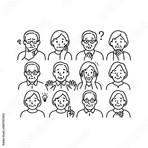 Elderly People Showing Different Emotions Black and White Doodle Style Drawing