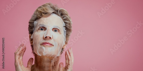Elderly person with a facial mask on a pink background. Skincare routine with a facial mask. Relaxing with a facial mask for skincare. Pink background. Anti-aging skincare routine for mature woman.