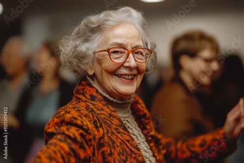 Elderly woman enjoying her time dancing with other seniors at a community center, promoting active aging and social connection