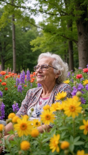 Elderly woman enjoying serene moment surrounded by colorful flowers in nursing home garden