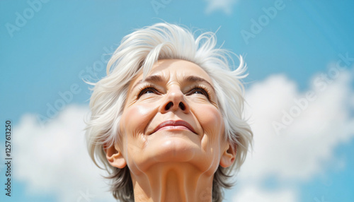 Elderly woman gazing upward, reflection of clouds in her eyes, introspection