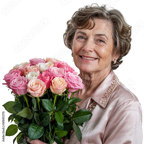 Elderly woman holding a bouquet of pink and peach roses smiling against a black background portrait