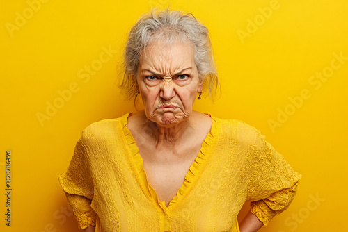 Elderly woman in a yellow shirt standing with hands on her hips and frowning intensely against a bright yellow backdrop