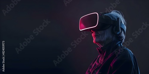 Elderly woman in neon VR headset futuristic tech horizontal website banner. Concept Elderly, Woman, Neon, VR Headset, Futuristic Technology