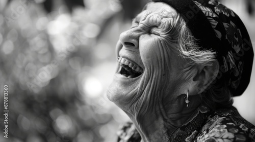 Elderly woman laughing outdoors during daytime