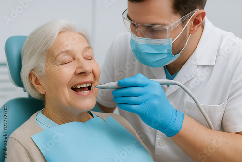 Elderly woman receiving dental treatment from dentist in clinic. concept of oral health, professional care, dental hygiene