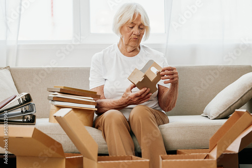 elderly woman sits on a sofa at home with boxes. collecting things with memories albums with photos and photo frames moving to a new place cleaning things and a happy smile. Lifestyle retirement.