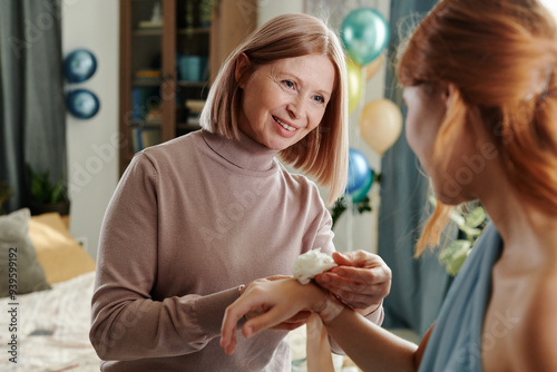 Elderly woman smiling warmly while holding younger woman's hand, conveying love and connection
