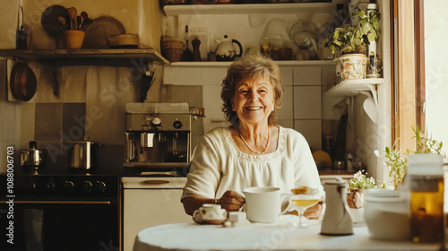 Elderly woman smiling while enjoying tea in cozy kitchen setting caring for the elderly concept.