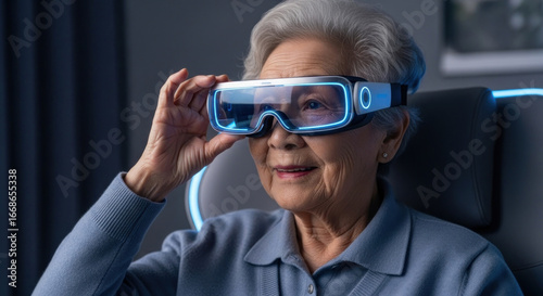 Elderly woman wearing futuristic augmented reality glasses, engaged in immersive technology experience at home