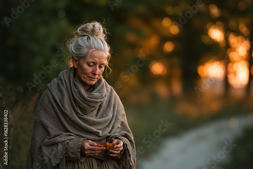 Elderly woman with white hair, gray shawl, holding sycamore bark peel, autumn nature. Concept of serenity, warmth, focus on sycamore bark peel, peaceful atmosphere outdoors.