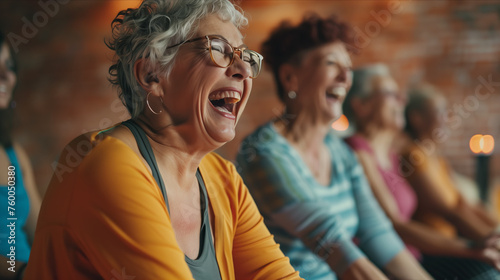 Elderly women laughing and sitting together in yoga studio.